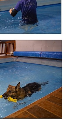 regular water therapy to help with spinal issues, several experienced swimmers and a 12 week old pup going